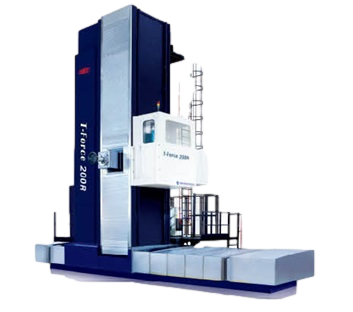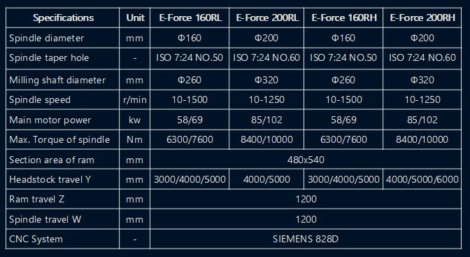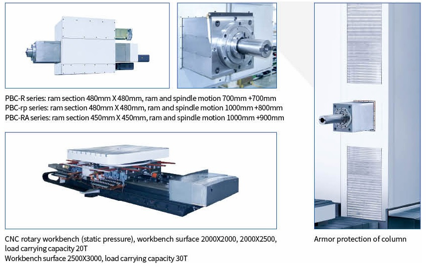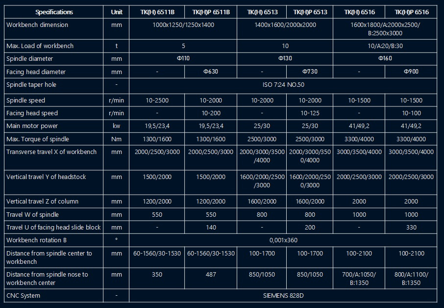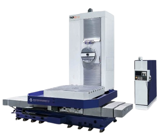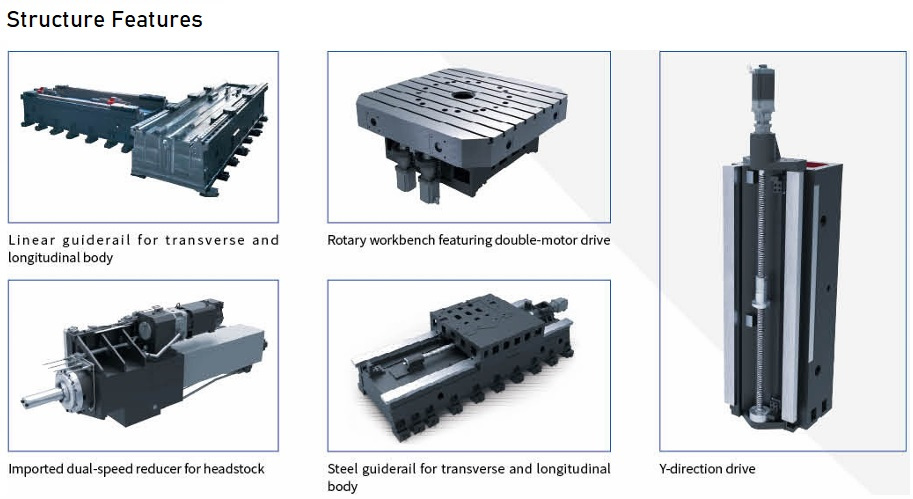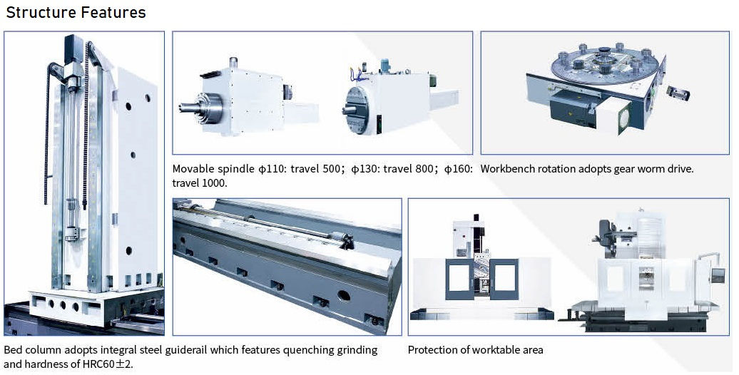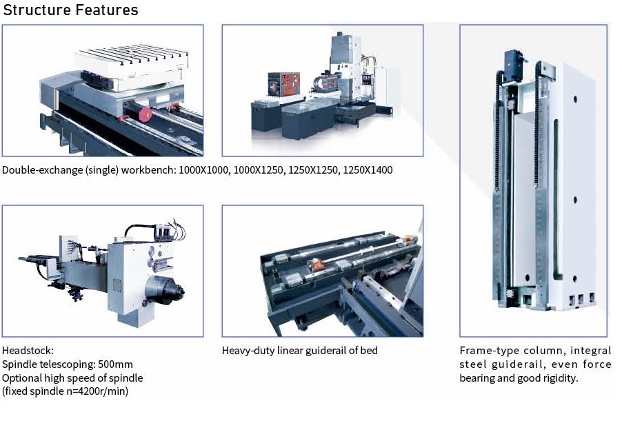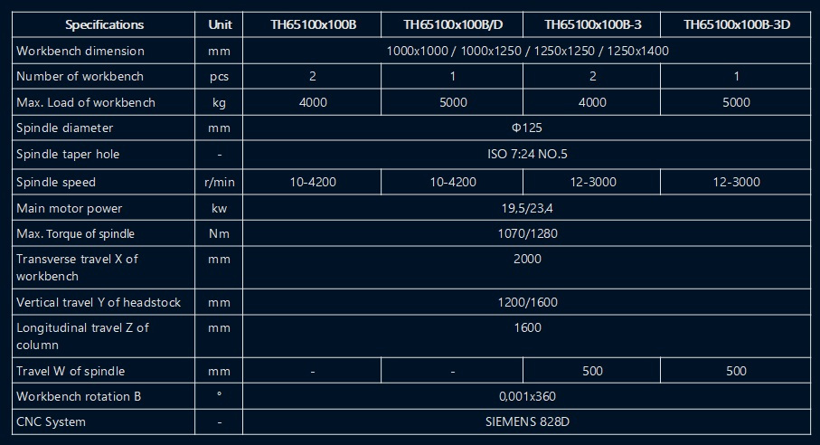 The product adopts side-to-side arrangement of two units of CNC horizontal boring and milling machine and workbench in middle. The workbench moves on transverse bed (X acis coordinate), lateral suspension headstock moves vertically along column guiderail (Y axis coordinate), two columns move on respective bed guiderail (Z axis coordinate), and spindle (boring shaft) moves in milling shaft (W axis coordinate)