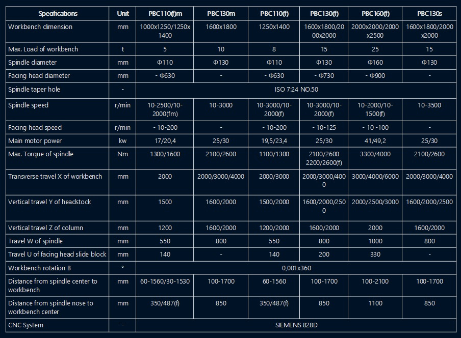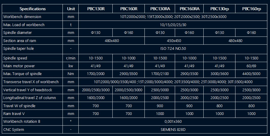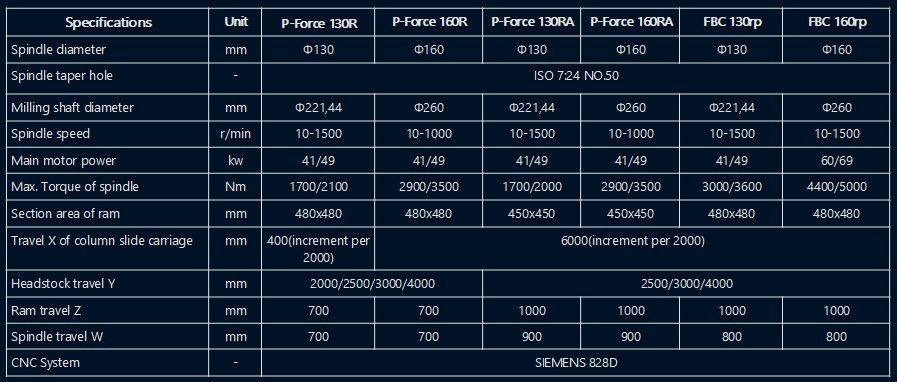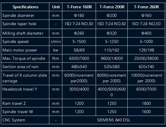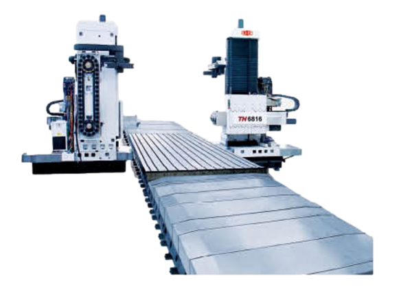 The product adopts side-to-side arrangement of two units of CNC horizontal boring and milling machine and workbench in middle. The workbench moves on transverse bed (X acis coordinate), lateral suspension headstock moves vertically along column guiderail (Y axis coordinate), two columns move on respective bed guiderail (Z axis coordinate), and spindle (boring shaft) moves in milling shaft (W axis coordinate)